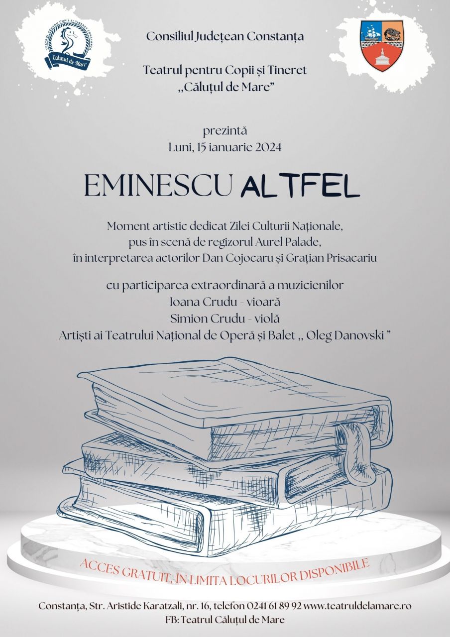 Cu prilejul ZILEI CULTURII NAȚIONALE, Teatrul pentru Copii și Tineret „Căluțul de Mare” vă invită, LUNI, 15 IANUARIE 2024, la un eveniment cultural -artistic și educativ - „EMINESCU ALTFEL”. Momentul artistic este dedicat aniversării a 174 de ani de la nașterea poetului național al României, Mihai Eminescu, „omul deplin al culturii...