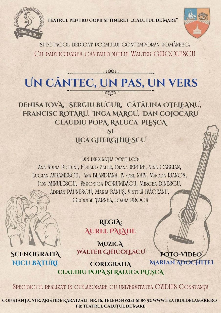 Teatrul pentru Copii și Tineret „Căluțul de Mare” vă invită, JOI, 05 decembrie 2024, de la ORA 18.30 la un spectacol de poezie, muzică și dans, dedicat poemului contemporan românesc și realizat cu participarea cantautorului Walter Ghicolescu.
