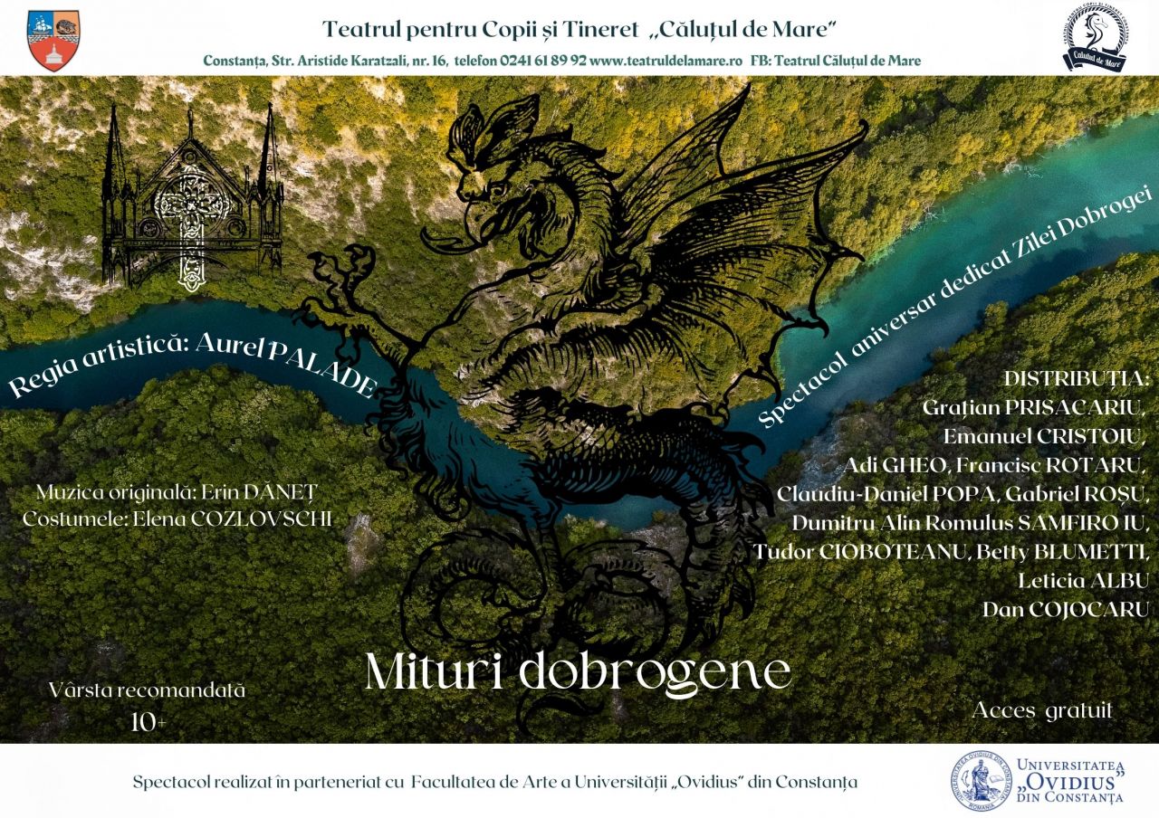 In ziua de MARȚI, 14 NOIEMBRIE 2023, de la ora 17.00, Teatrul pentru Copii și Tineret Constanța „Căluțul de Mare” vă invită la spectacolul aniversar MITURI DOBROGENE dedicat ZILEI DOBROGEI 2023 (se împlinesc 145 de ani de la Unirea Dobrogei cu România).